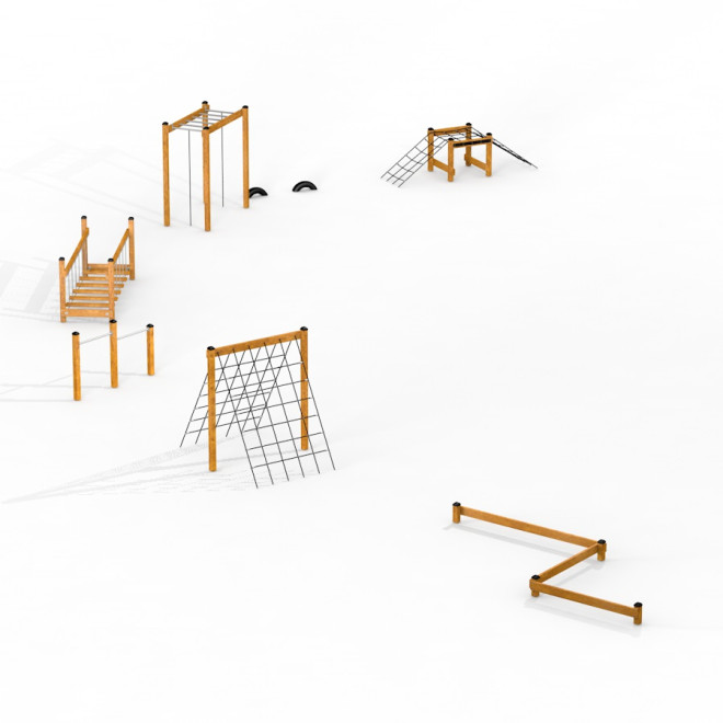 Ovaj jedinstveni trim trail izrađen je od kvalitetnog ariša, galvaniziranog čelika, recikliranog HDPE-a, ojačanih PP užadi, PE materijala i gume. Takva kombinacija osigurava dugotrajnost, otpornost na vremenske uvjete i sigurnost tijekom korištenja.